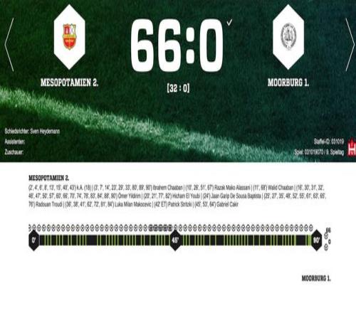 上周日的比赛成为德国地区联赛史上最惨烈的失利之一。穆尔堡TSV在汉堡地区联赛对阵梅索波塔米亚二队时,全场遭遇重创,90分钟内被攻入66球,平均每82秒丢一球。主教练帕特里克-施特里茨基坦言,这是一场彻底的噩梦。